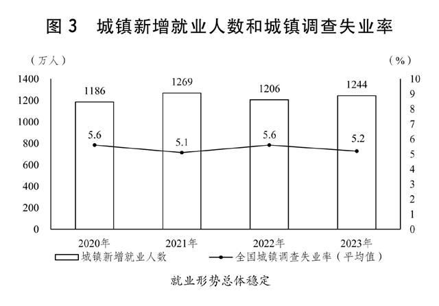 ——城镇新增就业1200万人以上,全国城镇调查失业率5.5%左右。关于城镇新增就业:主要考虑是,2024年新成长劳动力规模仍然较大,农村劳动力转移等就业结构调整也需要新的就业岗位,城镇新增就业目标由2023年的“1200万人左右”调整为2024年的“1200万人以上”,既是稳就业、调结构、增信心的客观要求,又体现了稳就业工作的力度和决心。关于城镇调查失业率:主要考虑是,在2024年经济运行风险挑战增多、重点人群就业压力较大的情况下,将预期目标稳定在5.5%左右,体现了就业优先的政策导向。