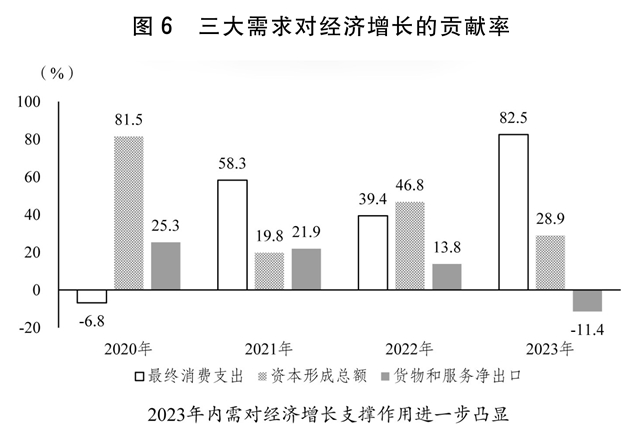(二)积极促消费扩投资,内需支撑作用明显增强。坚定实施扩大内需战略,把恢复和扩大消费摆在优先位置,大力促进有效投资,内需对经济增长的贡献率达到111.4%,其中最终消费支出贡献率为82.5%。