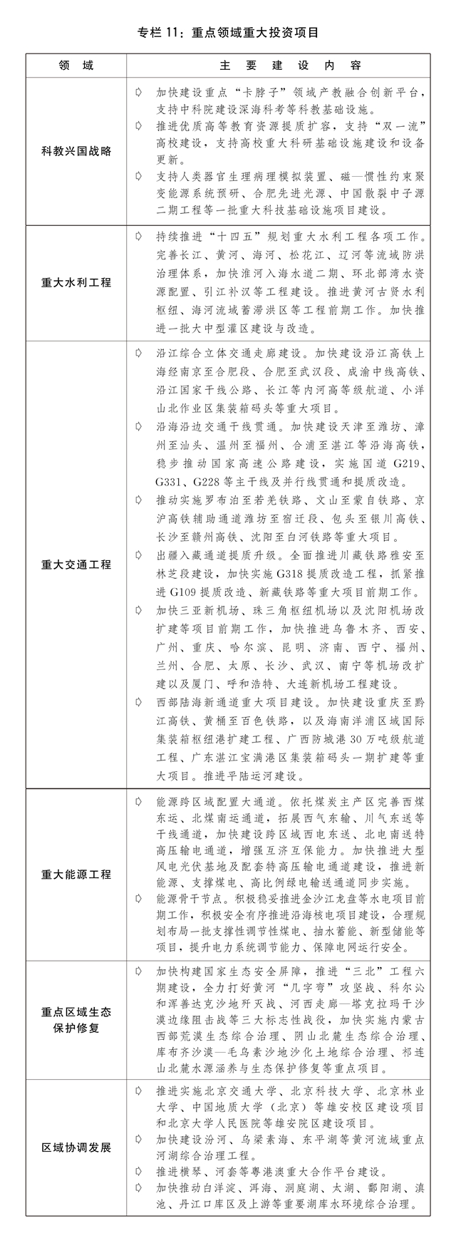 一是进一步推进区域协调发展。推进北京非首都功能疏解项目落地建设,抓好雄安新区一揽子支持政策落实,加快通州区与河北省北三县一体化、天津滨海新区高质量发展。继续加强长江经济带生态环境综合治理,持续推进长江十年禁渔。谋划制定新时期深化粤港澳大湾区建设的政策措施,辐射带动周边地区加快发展。出台实施持续深入推进长三角一体化高质量发展若干政策措施的意见,制定长三角生态绿色一体化发展示范区改革授权事项清单,协调解决长三角港口资源整合难点问题。支持海南自由贸易港进一步放宽市场准入,加大重点领域跨境服务贸易对外开放力度,夯实产业发展基础。打好黄河生态保护治理、污染防治、深度节水攻坚战,实施“一泓清水入黄河”等生态保护修复重大工程,支持沿黄省区因地制宜探索生态保护和高质量发展的创新路径。